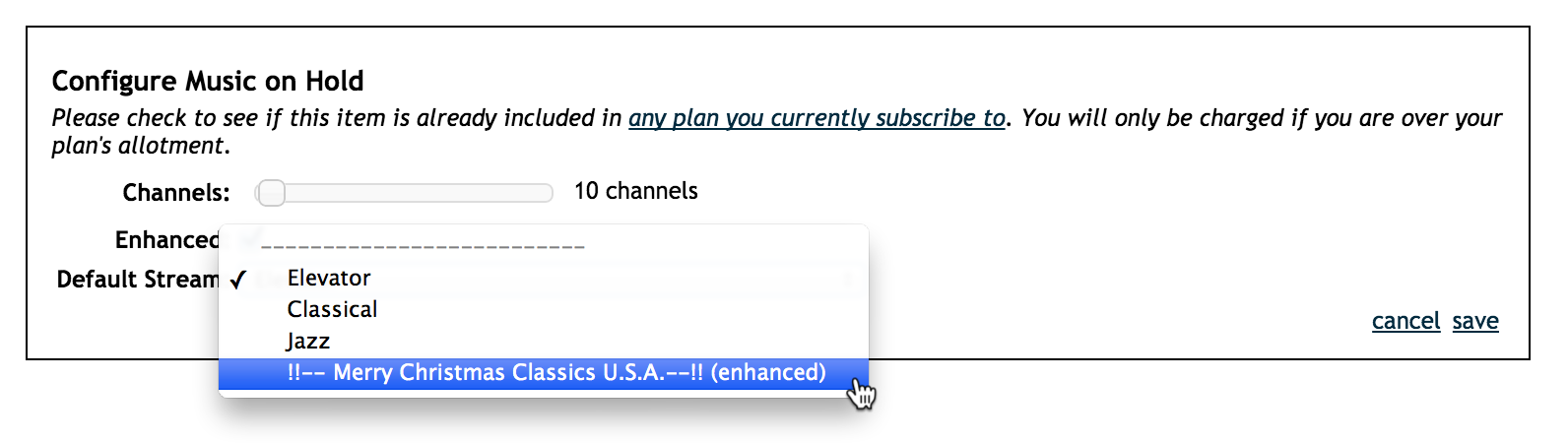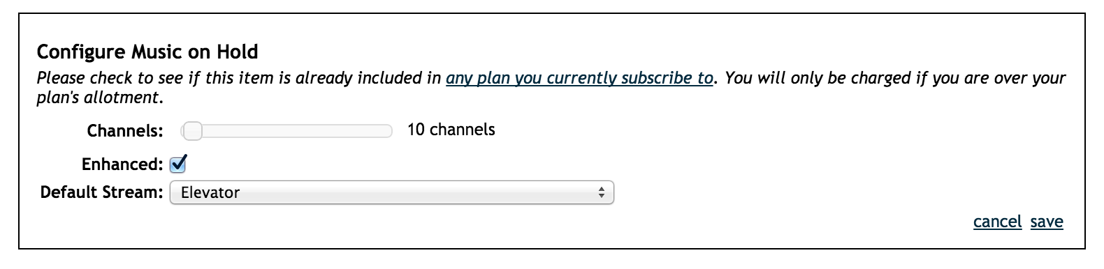 For Pay as You Go customers, this will cost an additional $19.95/per month on your bill; for Per Seat Metered customers, Enhanced Music on Hold is included in your monthly pricing.